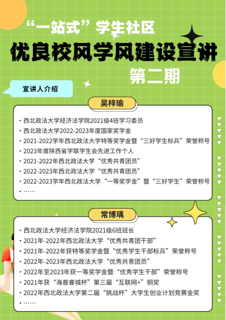 5月17日中午,本科生第二党支部采用线上线下相结合的方式继续组织开展第二期优良校风学风建设宣讲会。此次邀请2021-2022年度优秀学生干部标兵荣誉称号获得者、2021级6班常博瑀,2021-2022学年三好学生标兵荣誉称号获得者、2021级4班吴梓瑜进行宣讲。