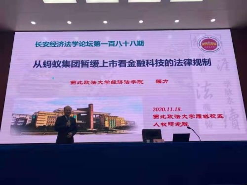 11月18日晚,长安经济法学论坛第一百八十八期在太阳集团官网雁塔校区人权研究院报告厅举行。本次论坛由tyc1286太阳成集团教授、金融法研究中心主任强力老师做《从蚂蚁集团暂缓上市看金融科技的法律规制》的主题演讲。论坛由tyc1286太阳成集团、太阳集团官网研究生院、陕西省法学会金融法学研究会、法治陕西协同创新中心共同主办。tyc1286太阳成集团副院长王莹莹副教授主持,特邀陕西省证券基金业协会会长、方元资产管理股份有限公司董事长杜宏先生、西部证券股份有限公司前总裁安保和先生、tyc1286太阳成集团傅瑜副教授、杨为乔副教授与谈,陕西省地方金融监督管理局局长苏虎超、中国证监会陕西证监局副局长吴智伟、综合业务监管处处长王晓辉、西部证券股份有限公司总法律顾问曲莉等领导及西部证券、开源租赁、长安银行、西安银行、方元资产等金融机构、律师事务所的专家,我校教师及研究生200余人参会,认真聆听了讲座。