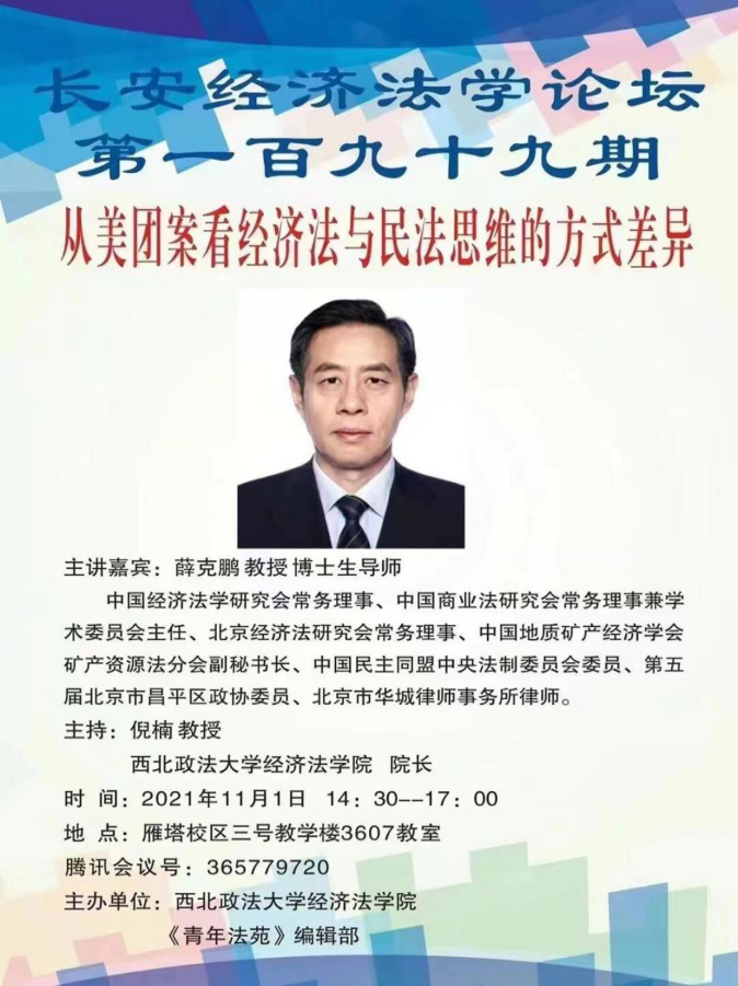 2021年11月1日下午,由tyc1286太阳成集团主办的“从美团案看经济法与民法思维的方式差异”学术讲座于太阳集团官网雁塔校区三号教学楼教室3607成功举行。本次学术讲座邀请中国政法大学民商tyc1286太阳成集团薛克鹏教授作题为《从美团案看经济法与民法思维的方式差异》的学术报告。本次学术讲座由tyc1286太阳成集团院长倪楠教授主持。我集团及兄弟学院各专业研究生、本科生共80余人参加了本次学术讲座。