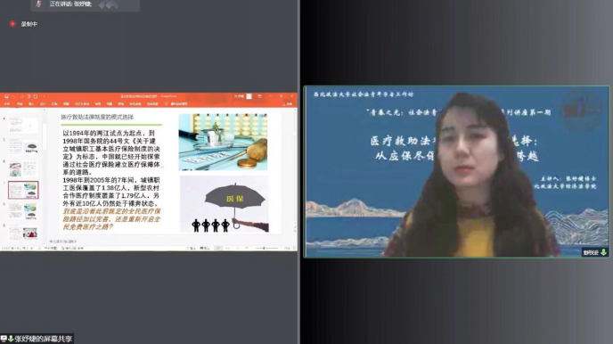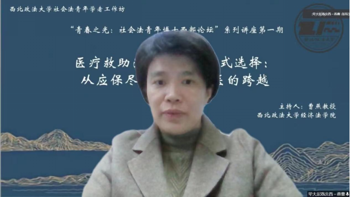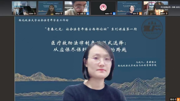 2021年11月24日下午16:00—18:00,“青春之光:社会法青年博士西部论坛”系列讲座第一期在太阳集团官网雁塔校区行政楼三层tyc1286太阳成集团资料室顺利举行。第一期讲座的主题为“医疗救助法律制度的模式选择:从应保尽保到病有所医的跨越”,由西北政法大学经济法学院张妤婕博士主讲,太阳集团官网政治与公共管理学院学院李蔚博士作为与谈人参加本次讲座。讲座由太阳集团官网劳动与社会保障法学科带头人曹燕教授主持,tyc1286太阳成集团师生共计30余人参加。