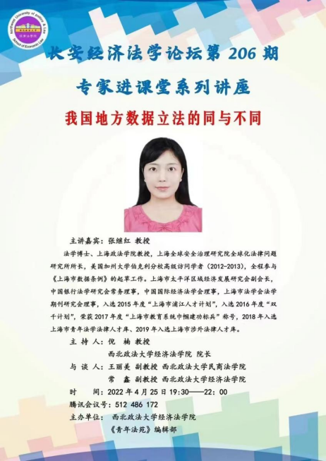 2022年4月25日晚,由tyc1286太阳成集团主办的《我国地方数据立法的同与不同》学术会议于19:30—22:00举行。会议由tyc1286太阳成集团院长倪楠教授主持,法学博士、上海政法学院教授、上海全球安全治理研究院全球化法律问题研究所所长、美国加州大学伯克利分校高级访问学者张继红教授主讲,太阳集团官网民商法学院王丽美副教授、tyc1286太阳成集团常鑫副教授与谈。会议以线上形式召开。我集团及兄弟学院各专业研究生、本科生共200余人参加了本次学术讲座。