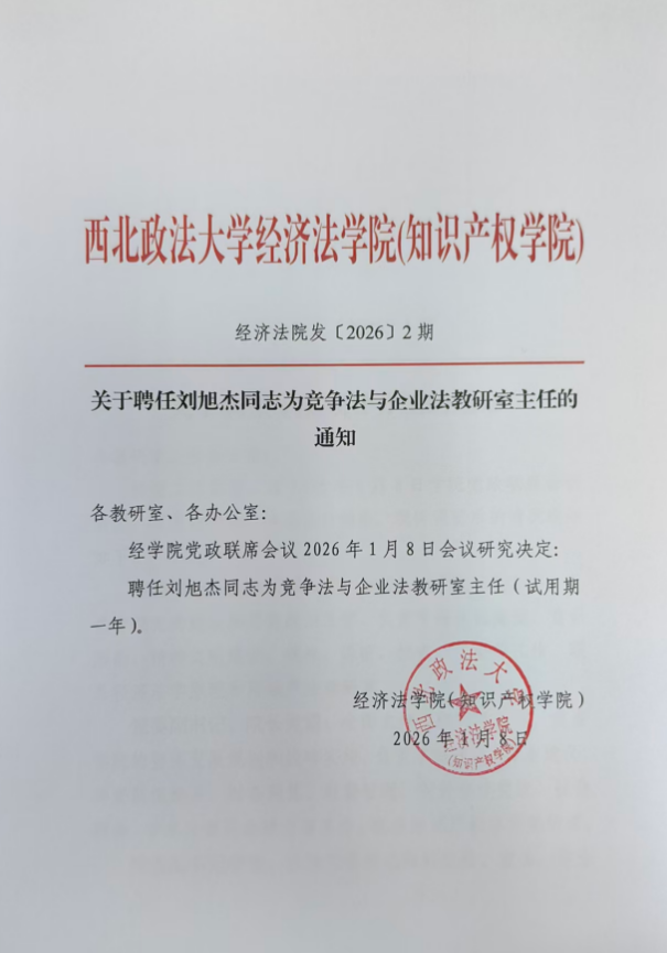 关于聘任刘旭杰同志为竞争法与企业法教研室主任的通知